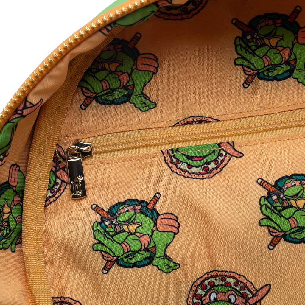 Get ready to kick some shell! Introducing the Loungthtefly Nickelodeon TMNT Michelangelo Cosplay Mini Backpack - 707 Street Exclusive. This faux leather Loungthtefly mini backpack features Michelangelo from the pizza-loving, crime-fighting group the Teenage Mutant Ninja Turtles. You'll find a green-colored base with pops of orange. The front pocket features his muscular, bottom shell with a belt and the letter "M". You'll find a pepperoni pizza slice as the zipper pull and a pizza box on one side pocket with the TMNT logo on the other. The back of the bag features the top of his shell too! Grab your nunchucks - this bag has everything you need for another day of saving the city!
