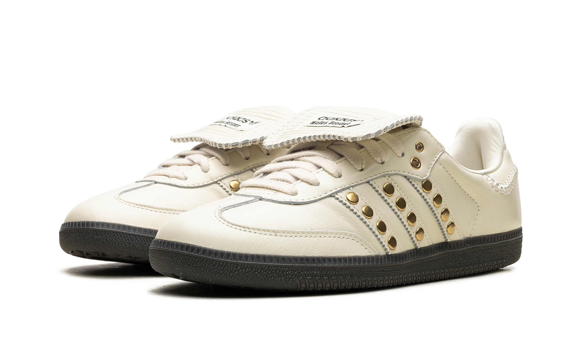 The Wales Bonner x adidas Samba "Studded Cream" is a collaboration by the talented fashion designer and adidas on a version of the retro shoe with metallic gold studs on its design. Grace Wales Bonner has played a key role in the resurgence of the adidas Samba, and with her “Studded Cream” colorway, continues her ultra successful collaborative history on the model. The “Studded Cream” features a Cream White leather construction with tonal leather overlays. The Three Stripes branding has metallic gold studs that give the shoe a decidedly high fashion-inspired look. Additional details include white stitching along the heel, a folded tongue, and a dark gum rubber sole. Wales Bonner - Studded Pack - Cream